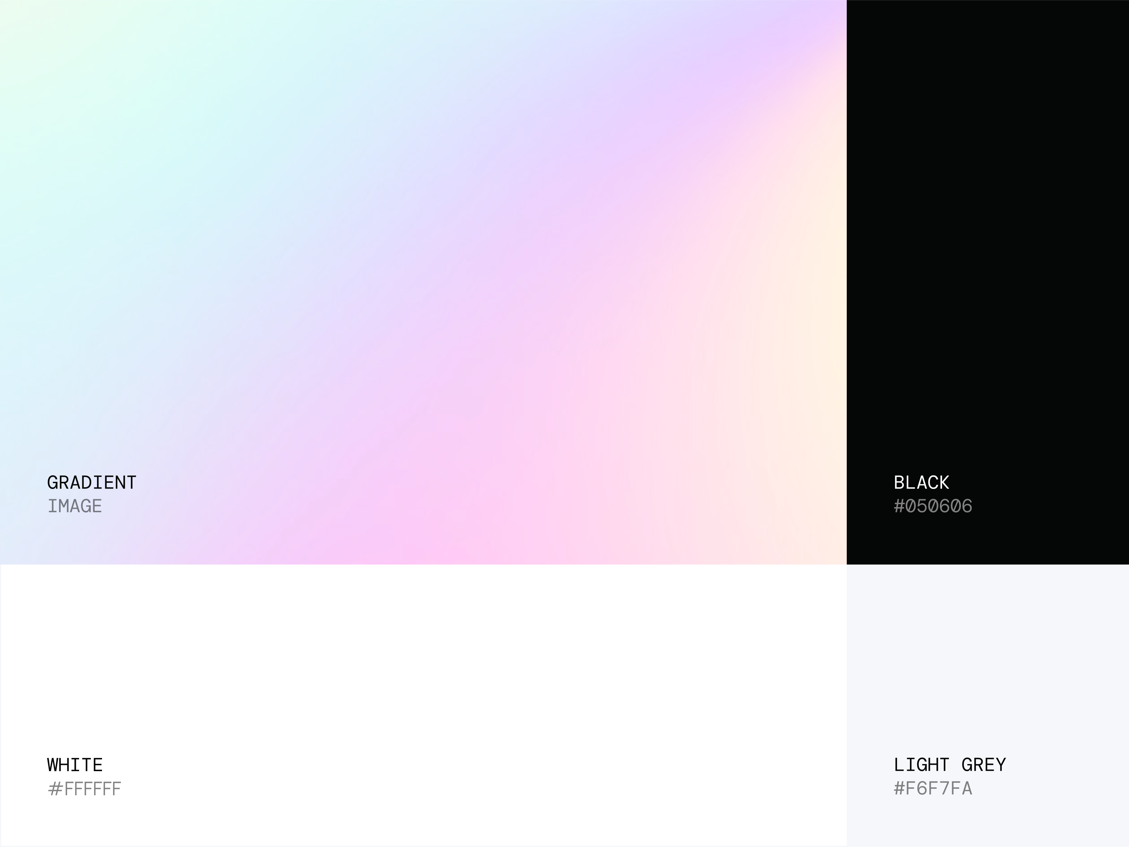 The color palette features elegant neutral tones —white & black— highlighting minimalism and elegance, complemented by a dynamic gradient from soft violet to sky blue, which evokes innovation and modernity.