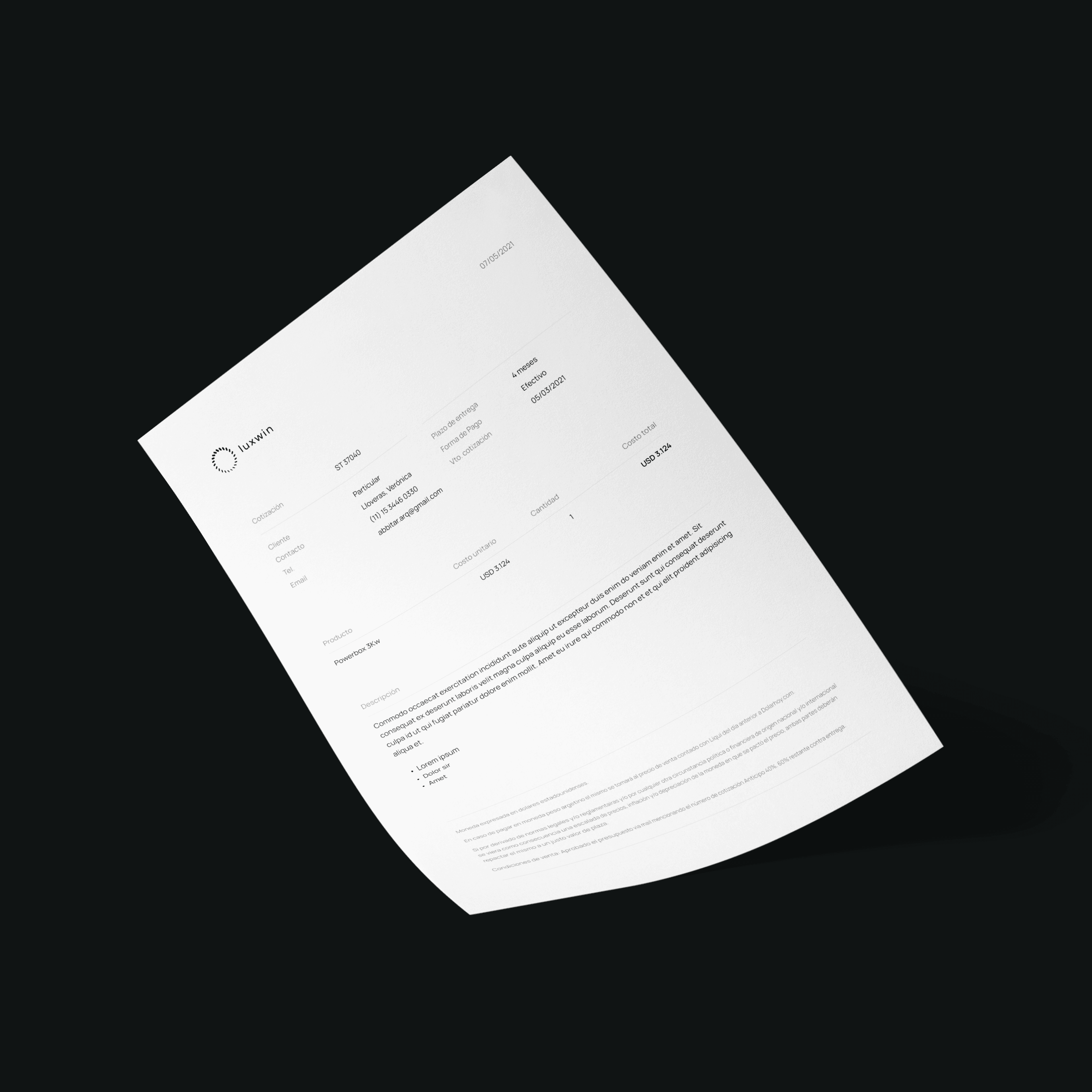 As the product launch approached, I designed a series of stationery materials for Luxwin that included personal cards, templates for quotes, and manuals, maintaining coherence with the visual identity of the brand.