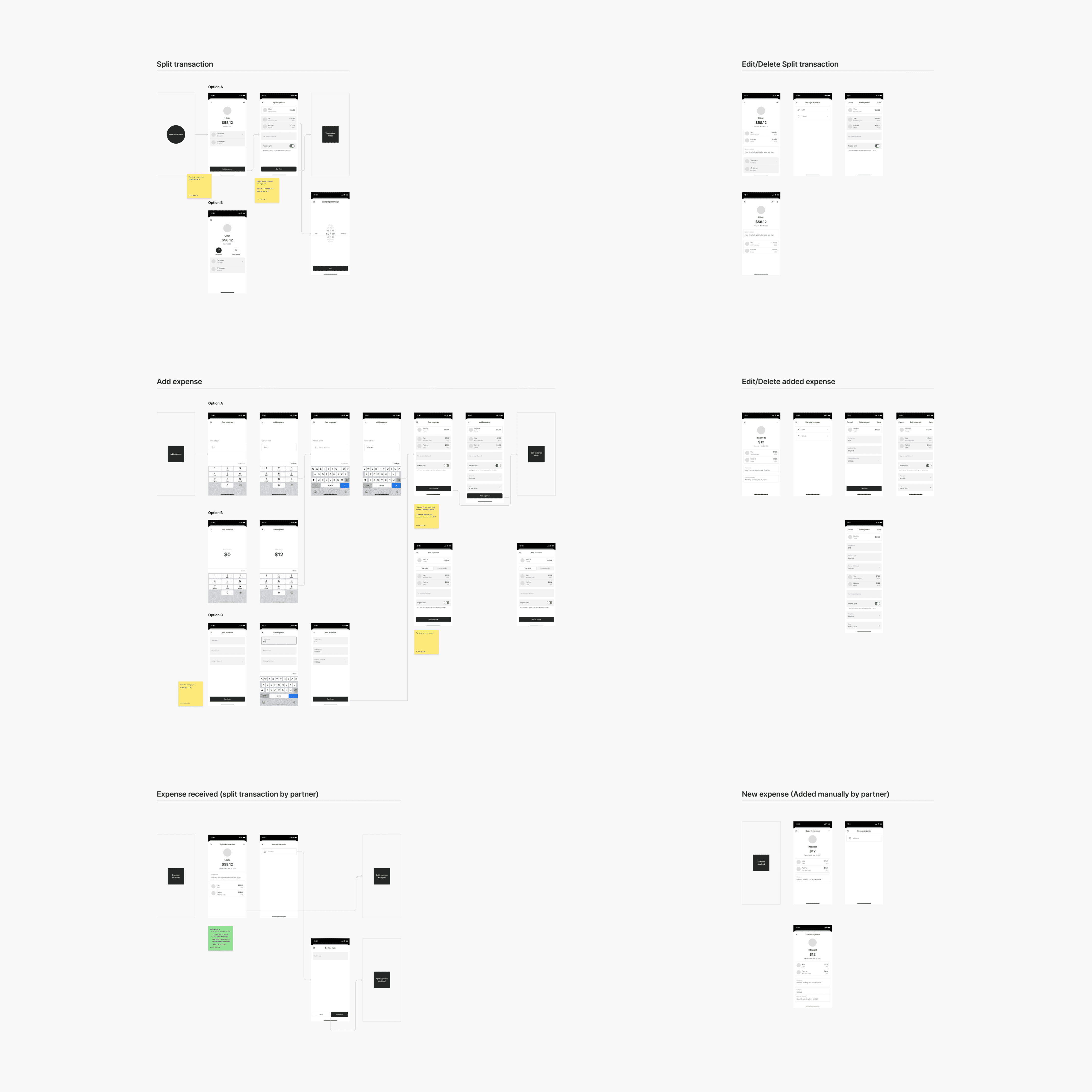 Once the user flows were established, we proceeded to the wireframing stage, exploring different alternatives for various flows and screens. Through low-fidelity screen designs and guerrilla testing, we identified effective enhancements, notably the split ratio component, which proved crucial for user interaction.